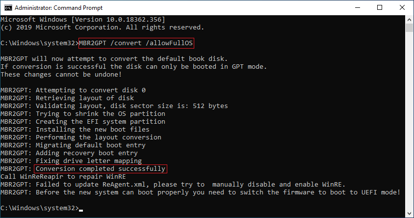 Some 3rd-party software has the option to convert system disk from MBR to GPT, but few can ensure 100% system bootable. To convert a MBR system disk to GPT, it is suggested to run MBR2GPT which is provided by Microsoft. If you want to convert a data only disk to GPT, jump to next section. MBR2GPT cannot convert data disk from MBR to GPT.