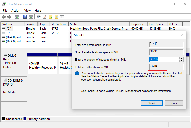 - If you still receive this error, manually enter an smaller amount in the shrinking window.