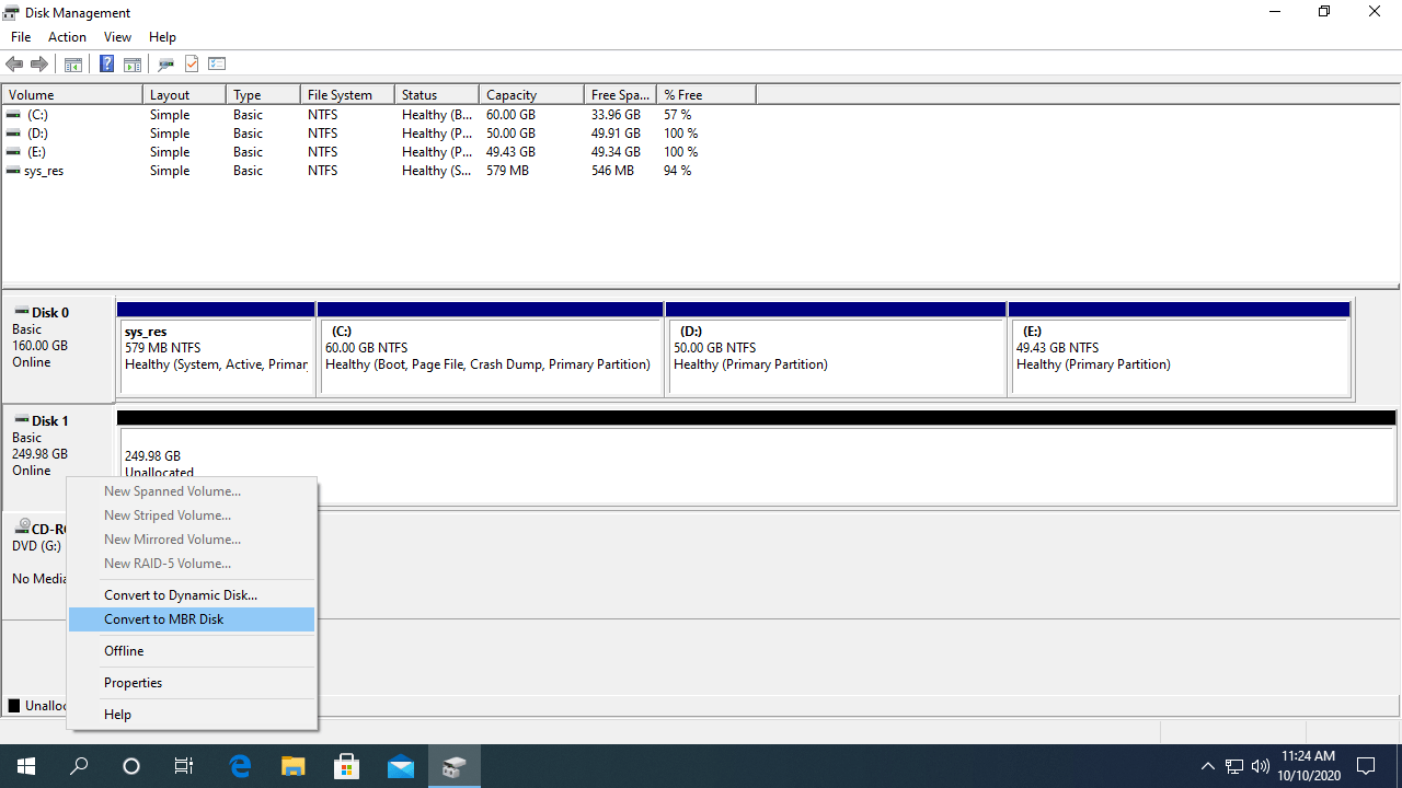 When there's a partition on this disk, you cannot convert disk type in Disk Management, because the convert option is grayed out.