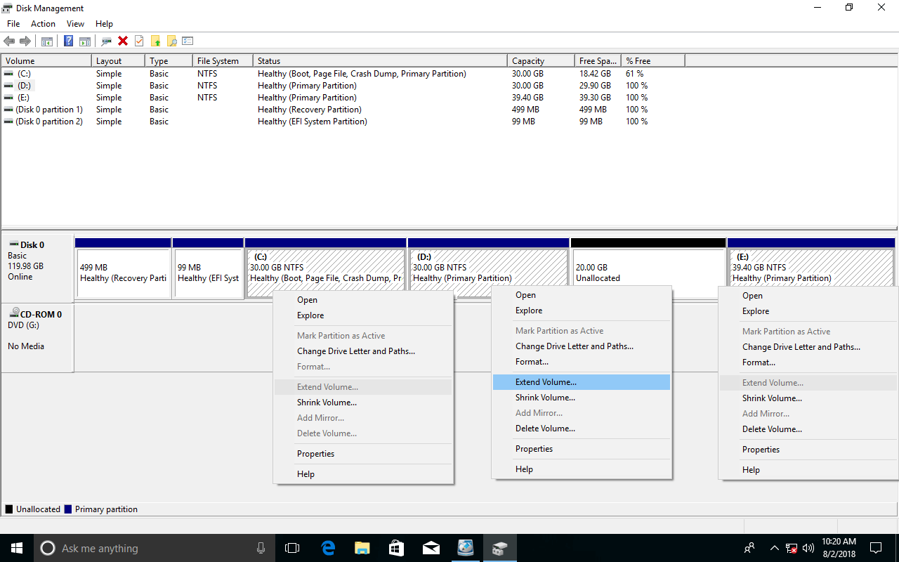 As you see in the screenshot, Extend Volume is disabled for C and E drive after shrinking D. Because Unallocated space can only be generated on the right when shrinking D: drive. This space is non adjacent to C drive and is on the left of E drive, therefore, Extend Volume is grayed out.