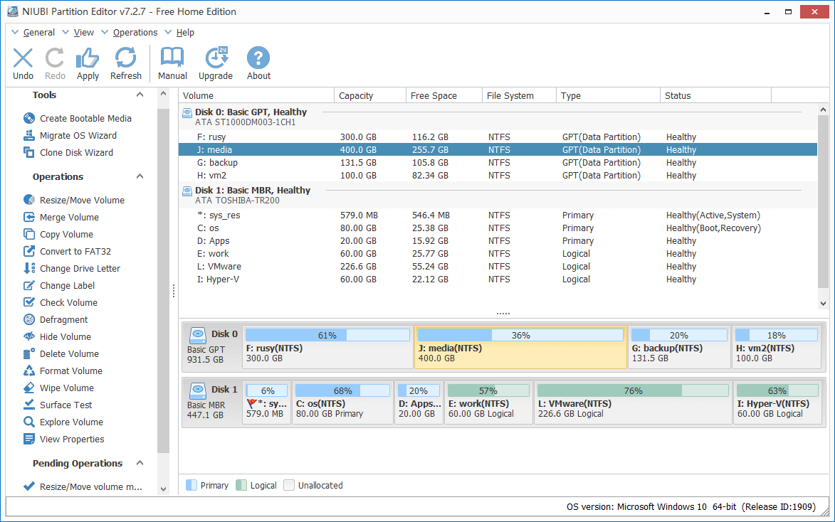 NIUBI Partition Editor Free Edition is 100% free for home users, 100% clean without any bundles. It is specially designed for Windows 10/8/7/Vista/XP (32 and 64 bit). You can fully resize volume and manage disk partition the same with paid version. This free partition manager is widely used and highly recommended by many professional editors.
