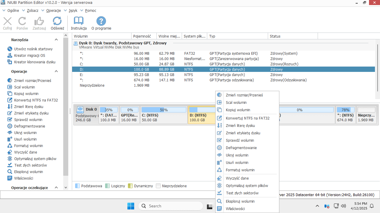 Ten menedżer partycji serwera obsługuje Windows Server 2025, 2022, 2019, 2016, 2012, 2008 i 2003. Obsługiwane są dyski HDD/SSD z dowolnym interfejsem, wszystkie typy macierzy RAID, maszyny wirtualne VMware/Hyper-V, dyski flash USB i karty pamięci.