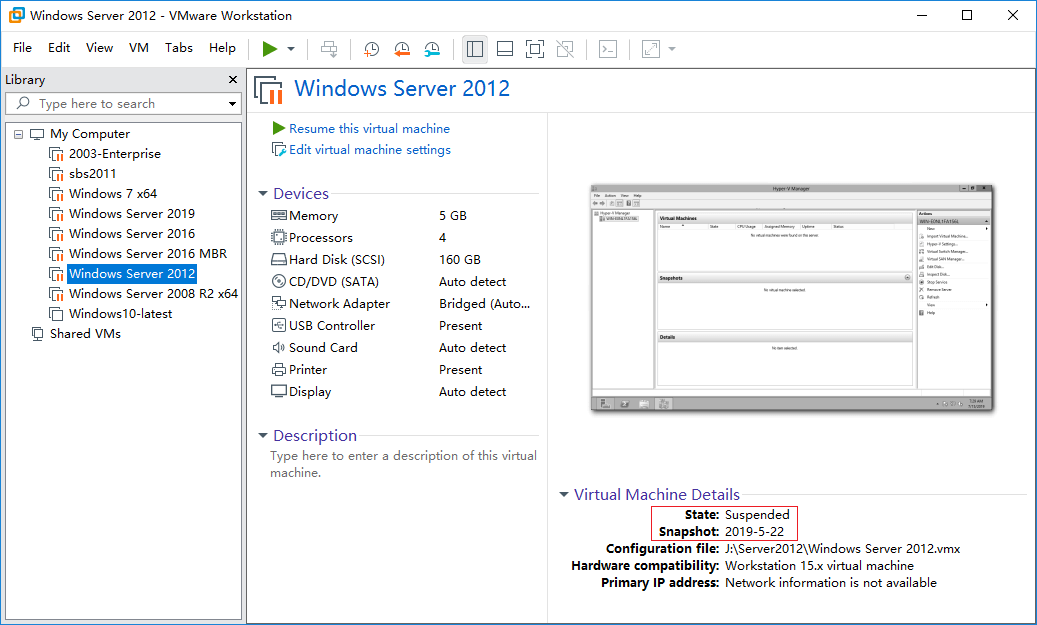 In my Windows Server 2012 virtual machine, there is a snapshot and its state is Suspended.