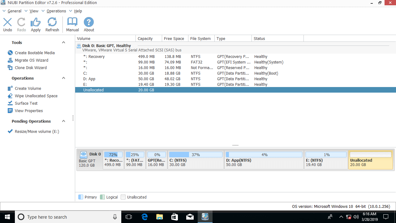 Windows native tools including Disk Management cannot move partition in any way, so you need to run professional disk partition software. There are many choices in the market, but among them NIUBI Partition Editor has unique 1 Second Rollback, Cancel-at-will, Virtual Mode, Hot-Resize technologies and advanced file-moving algorithm to repartition hard drive more safely and faster. In this article, I'll show you how to move Windows 10 partition with detailed steps.