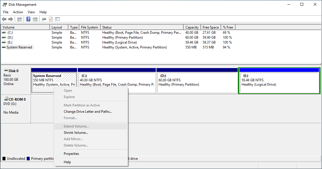 Although there's "Extend Volume" function in Windows 10/8/7 Disk Management tool, it cannot extend System Reserved partition by shrinking C or other volume. Because when extending a partition with Disk Management, there must be adjacent Unallocated space on the right. If you shrink the adjacent C drive, Unallocated space is nonadjacent to the System Reserved partition.