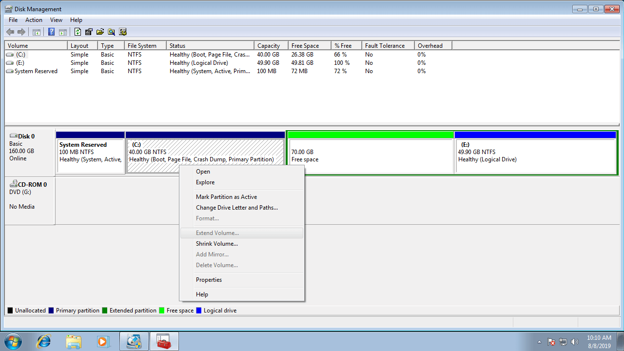 A 160GB hard disk cannot be increased to 250GB (except virtual disk), so before extending a drive you must shrink or delete another one to get Unallocated space. If you right click C drive directly, of course Extend Volume is greyed out.