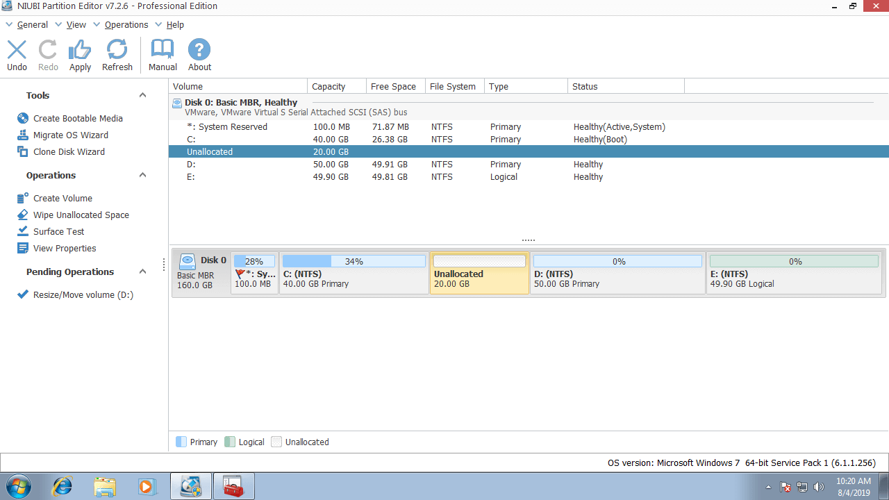 Step 1: right click drive D: and select "Resize/Move Volume", drag middle towards right in the pop-up window.