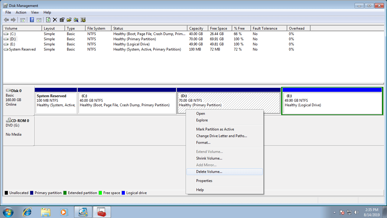 - Right click D: drive and select Delete Volume.