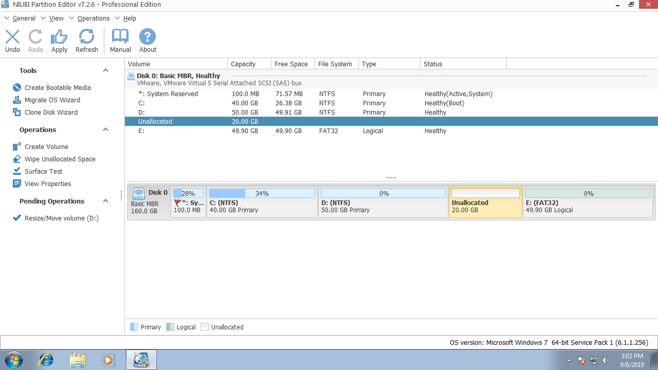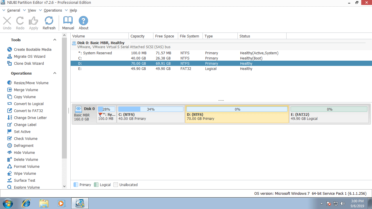 Download NIUBI Partition Editor and you'll see the main window with disk partition structure and other information.