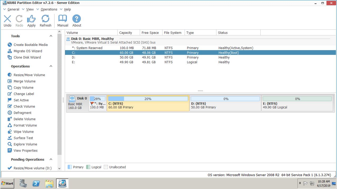 Download NIUBI Partition Editor and you'll see the main window with disk partition structure and other information on the right, available operations to selected disk or partition are listed on the left or by right clicking. In my test server, there is drive C, D, E and System Reserved partition in same Disk 0.