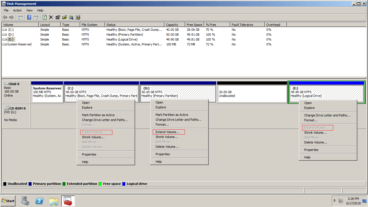 As you see in the screenshot, Extend Volume greyed out for both C and E drive after shrinking D, this is because: