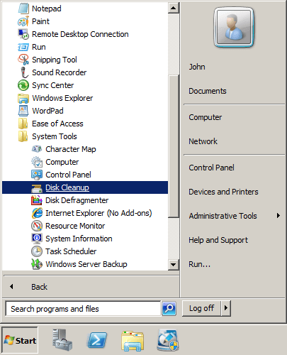 There are 3 ways to run Disk Cleanup in Windows Server 2008 R2: