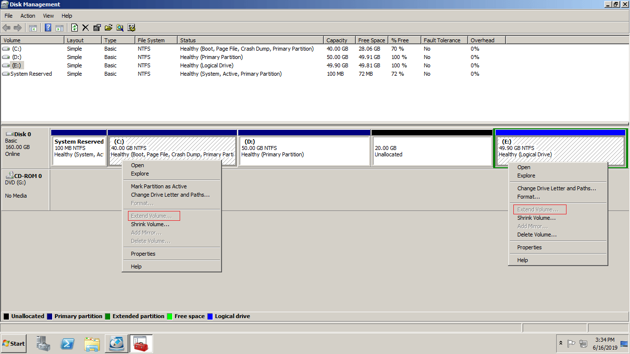 As you see in my server, Extend Volume greyed out for C: and E drive after shrinking D, because the unallocated space that shrunk from D is nonadjacent to C: and is on the left of E drive.
