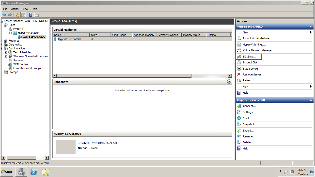 Step 1: Open "Server Manager" next to "Start" menu, expand Roles on top left and then Hyper-V > Hyper-V Manager > your own, click "Edit Disk" on the right.