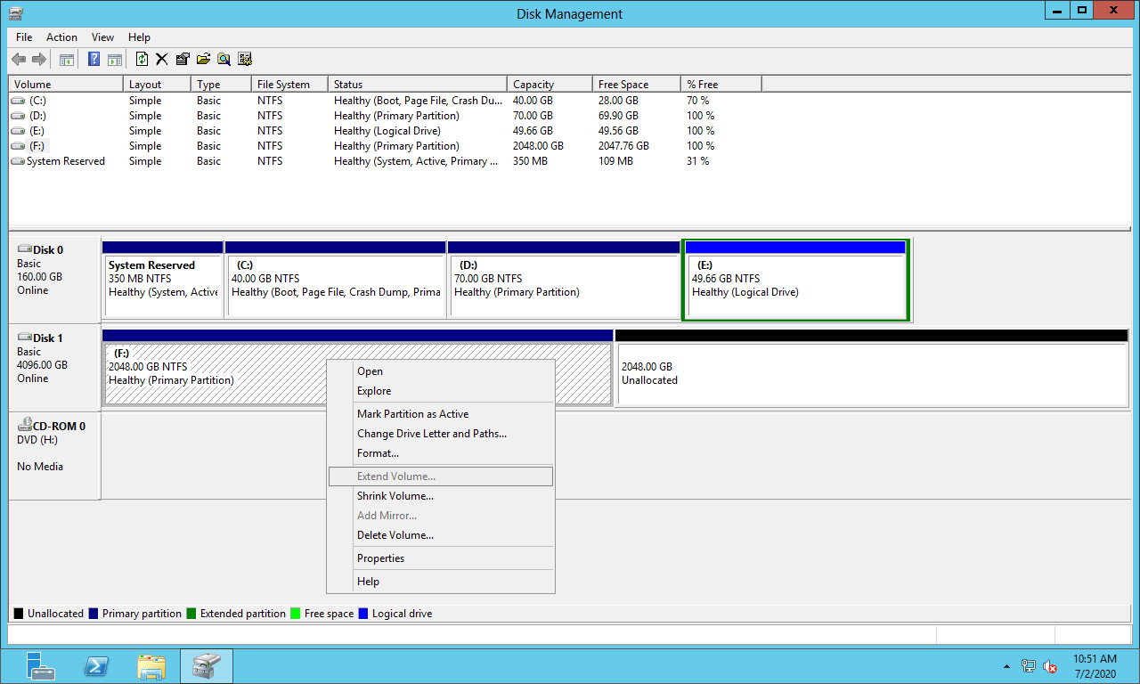 Why Extend Volume is disabled in Server 2012 Disk Management