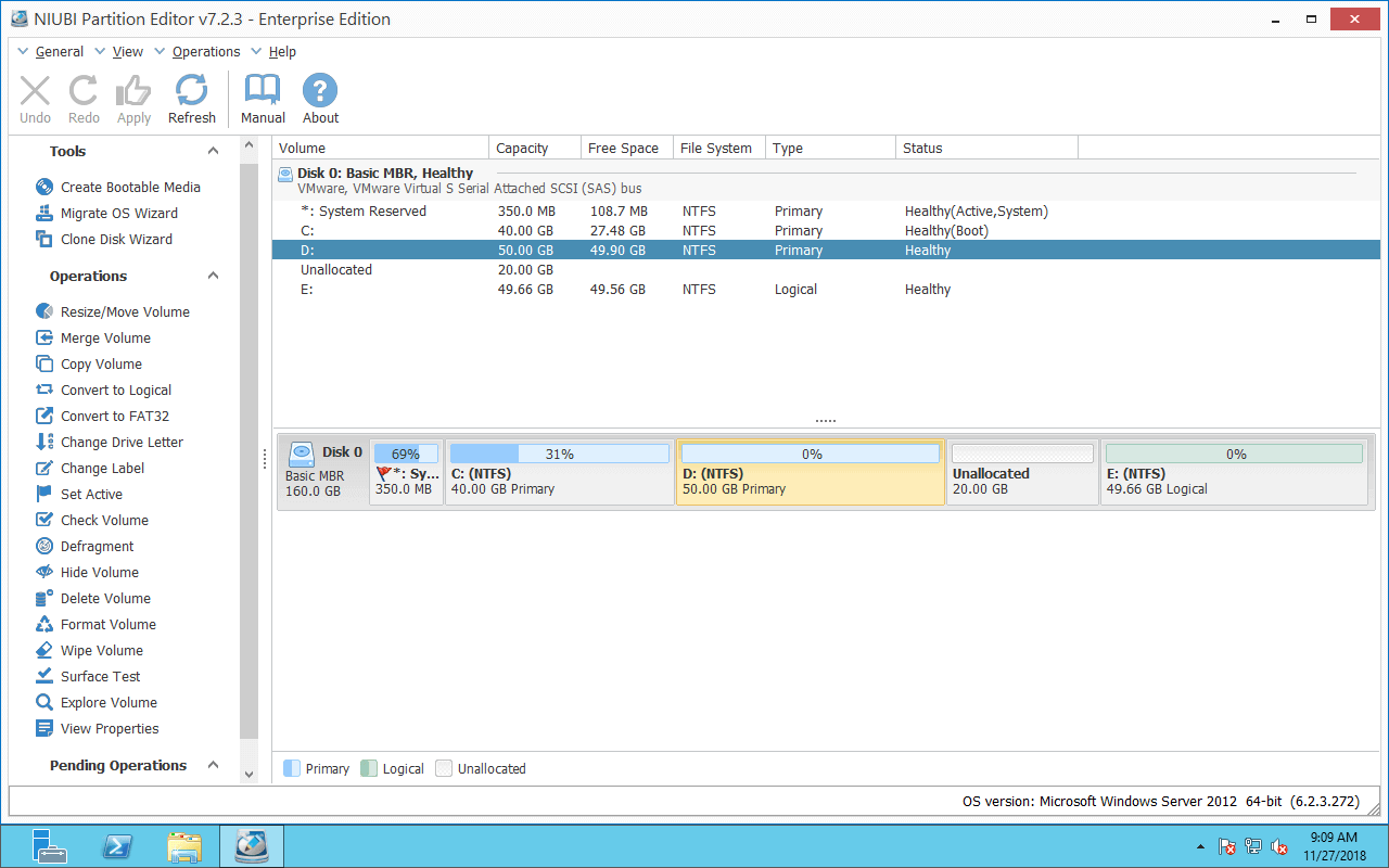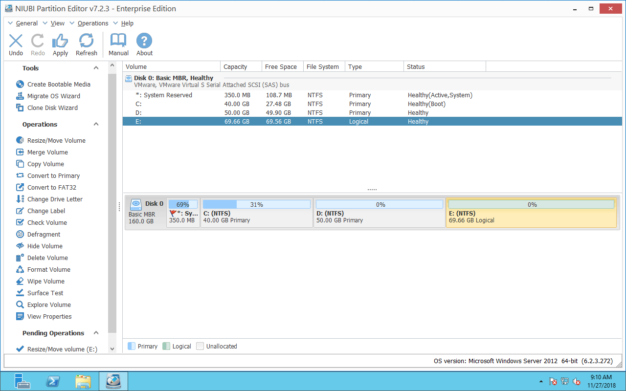 Besides moving partition in Windows Server 2012/2016/2019/2022/2025 and previous Server 2003/2008, NIUBI Partition Editor helps you do many other disk/partition management operations, such as shrink, extend, merge, convert, wipe partition, optimize file system, scan bad sectors.