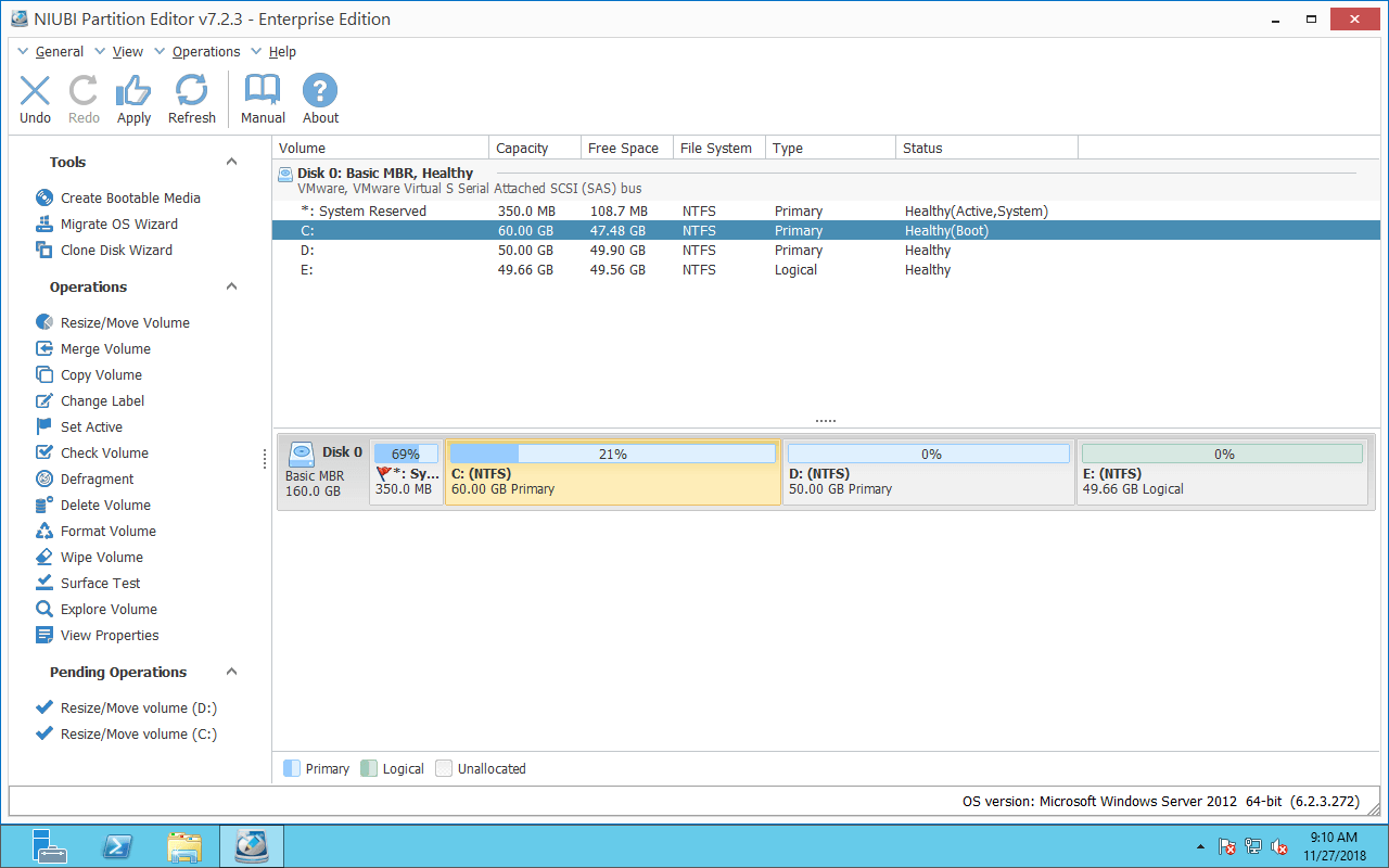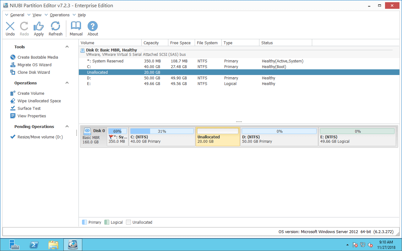 After running the server for a period of time, sometimes you need to move partition. For example, you cannot extend C drive in Server 2012 with Disk Management after shrinking D or E drive. To solve this problem, you need to move partition D/E to the right and make unallocated space adjacent to C drive. If all these partitions are getting full, you can move a volume to another disk, then delete it and add its disk space to C drive. In some servers, there's Recovery or EFI partition in the middle of C and D drive. This article introduces how to move partition in Windows Server 2012 R2 with safe partition software.