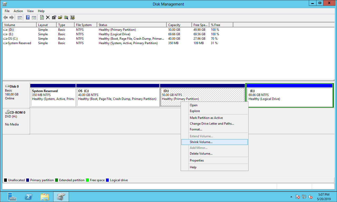 Shrink partition in Server 2012 via Disk Management