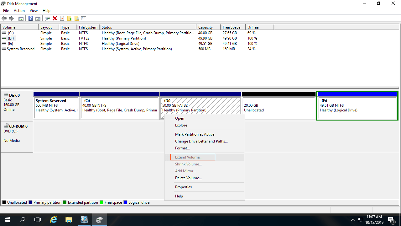 In my computer, the 20GB unallocated space that shrunk from D drive is non-adjacent to C drive and is on the left of E, so Extend Volume is disabled.