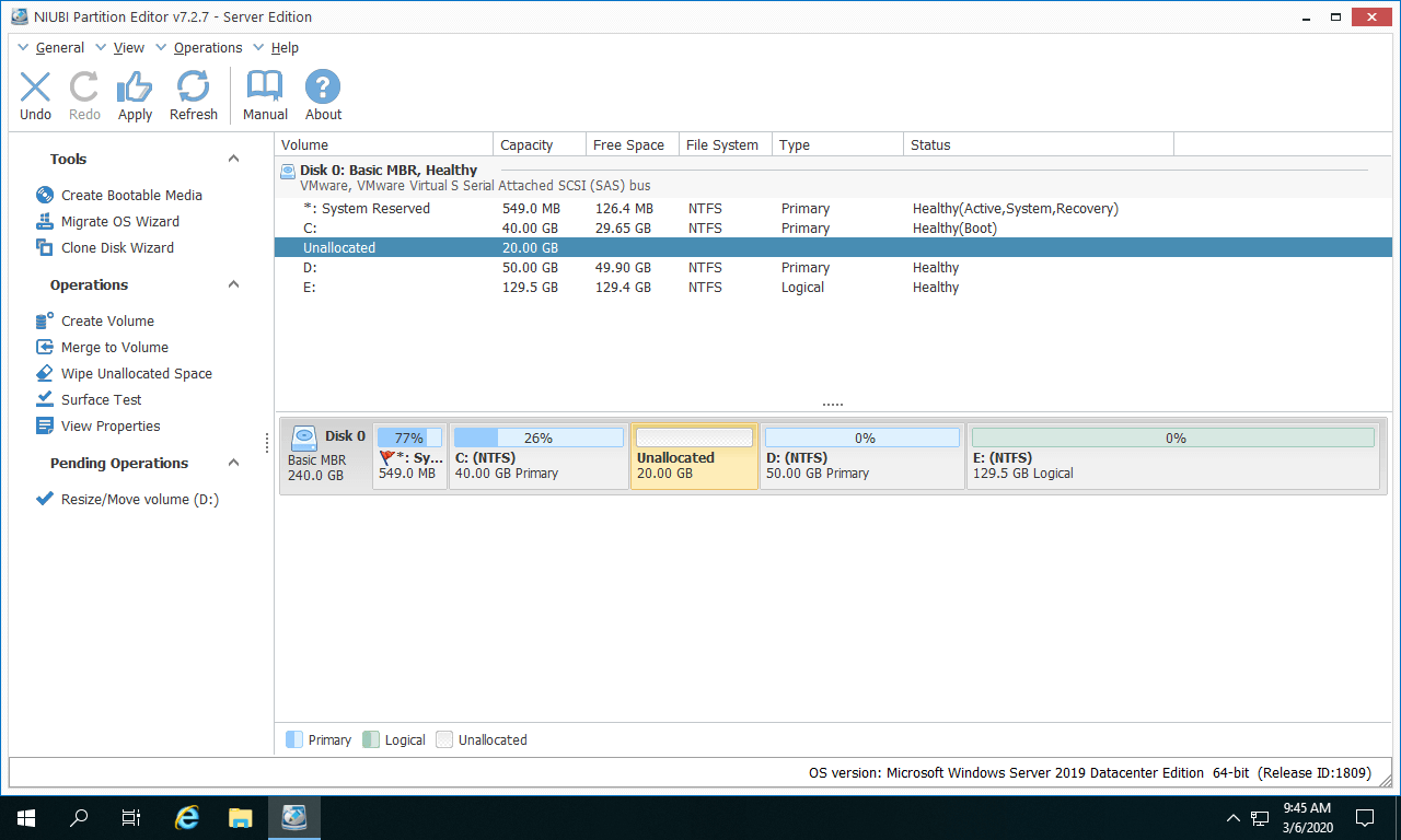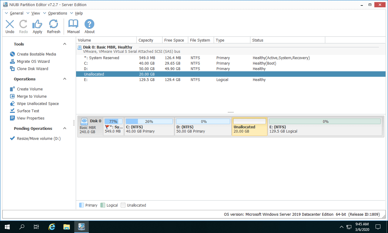 Besides shrinking and extending disk partition in Windows Server 2019/2022/2025 and previous Server 2003/2008/2012/2016, NIUBI Partition Editor help you do many other operations such as move, merge, copy, convert, defrag, optimize, hide, wipe partition and scan bad sectors, etc.